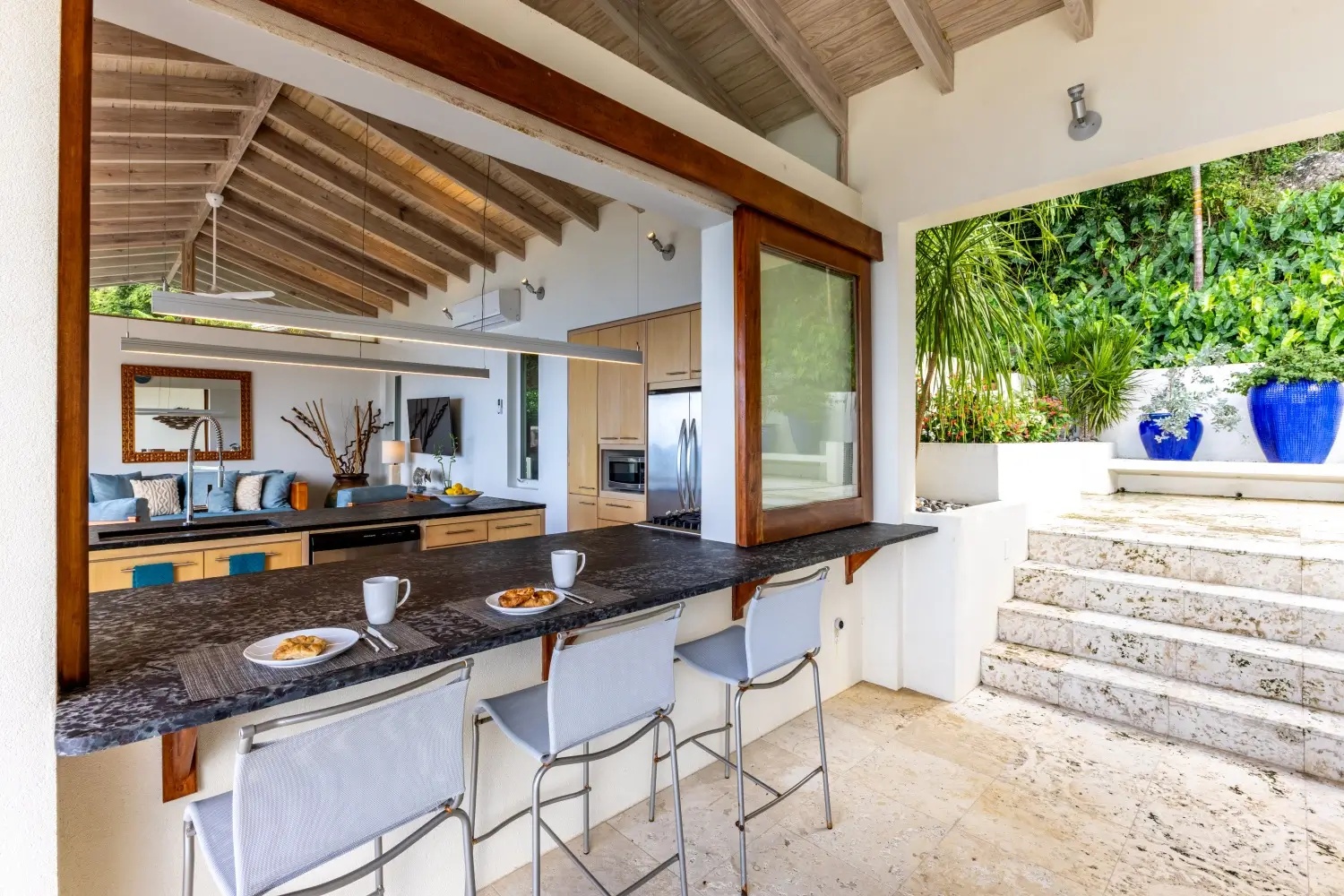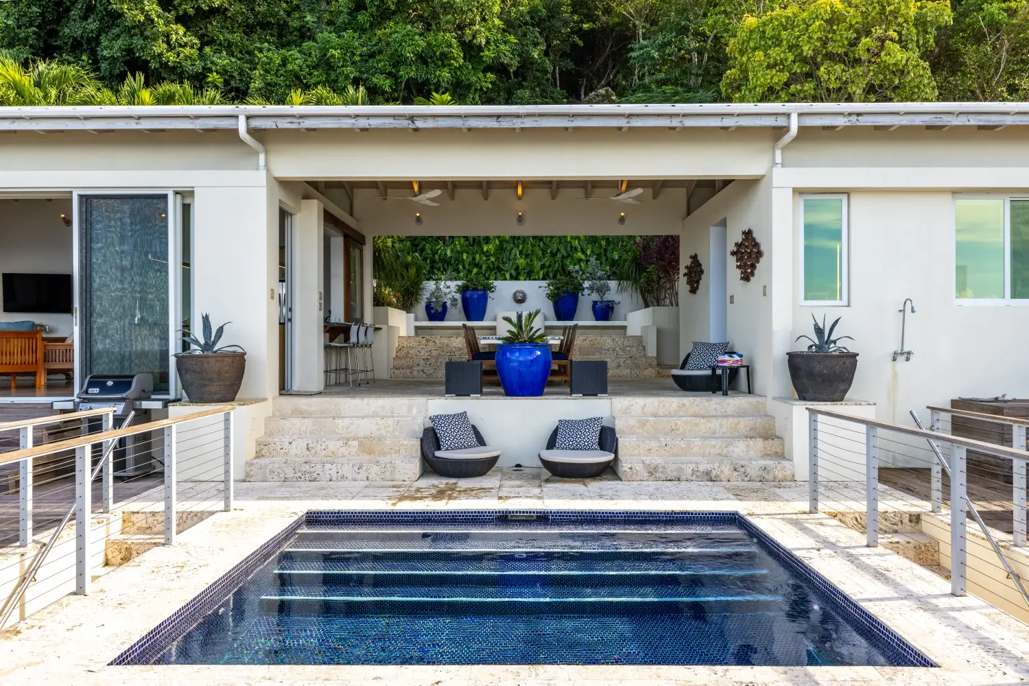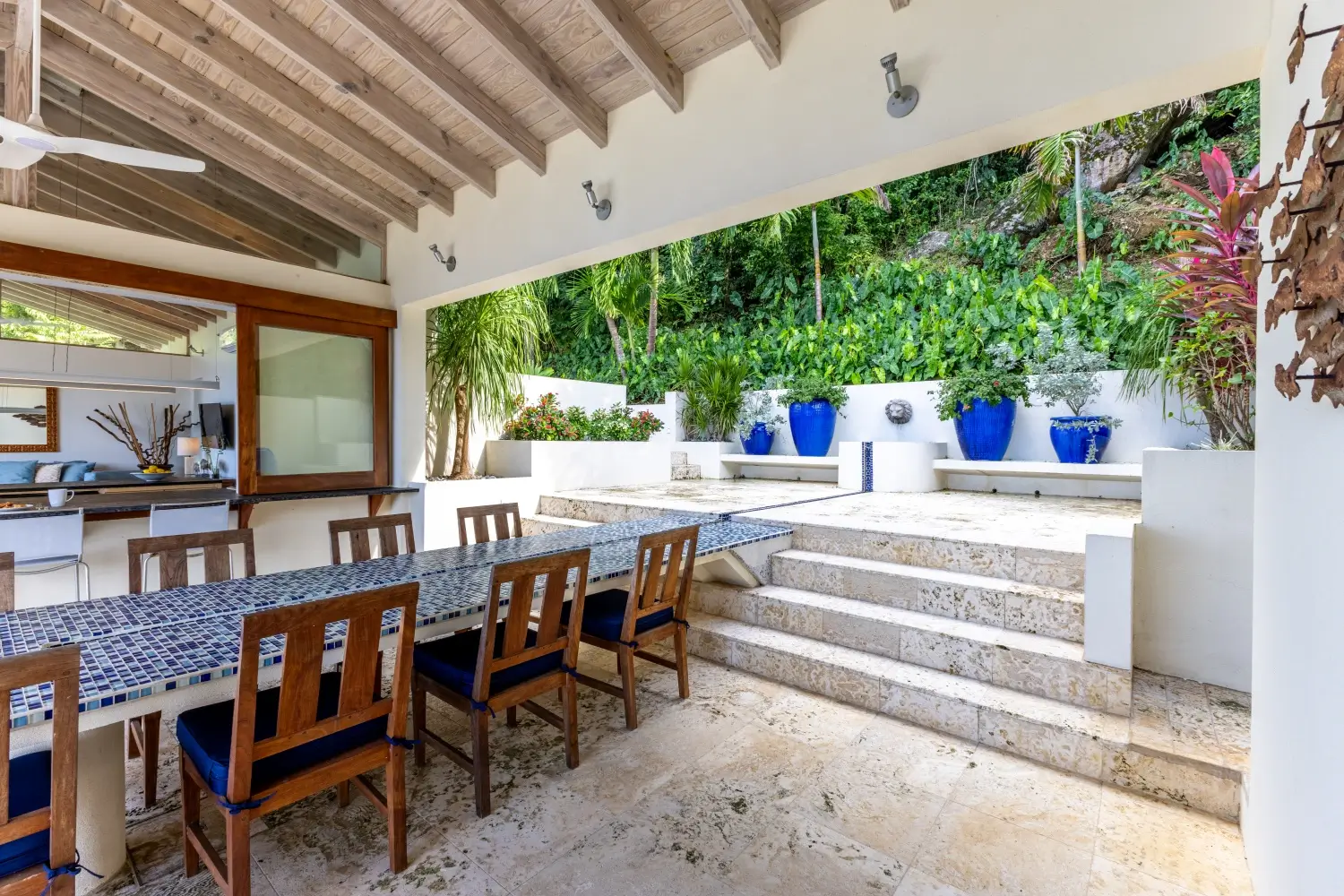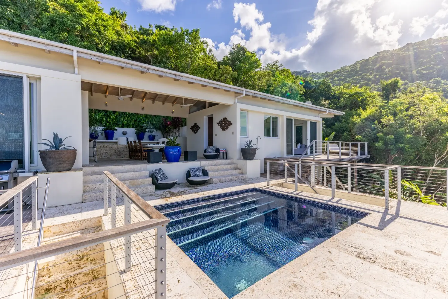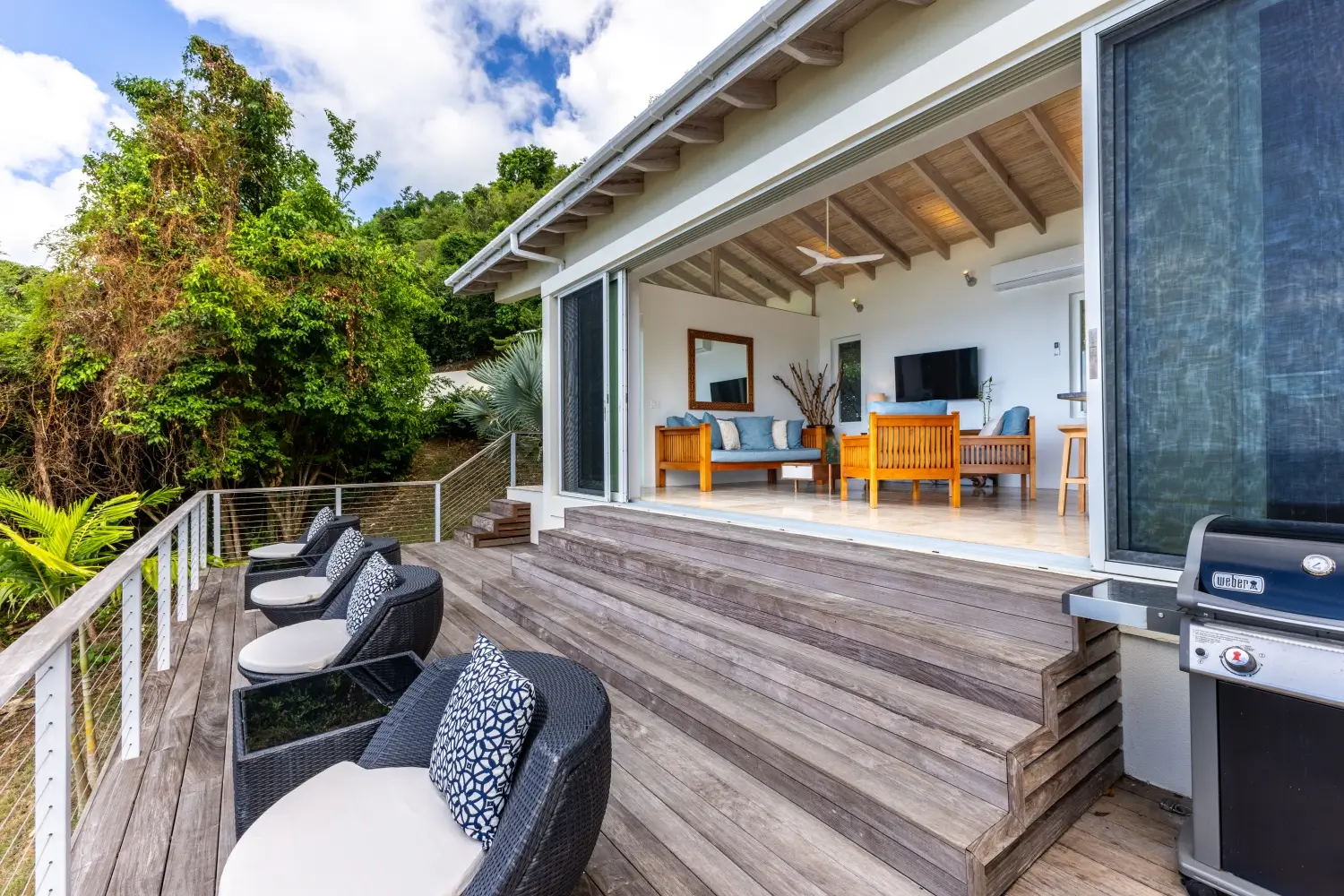 | Expansive patio overlooking pristine Trunk Bay beach 3.5 Baths Unique covered open-air dining table with built-in water feature Non-smoking Dishwasher Linens Outdoor BBQ grill Private walking path connecting to Villa Soleil if both are rented |
