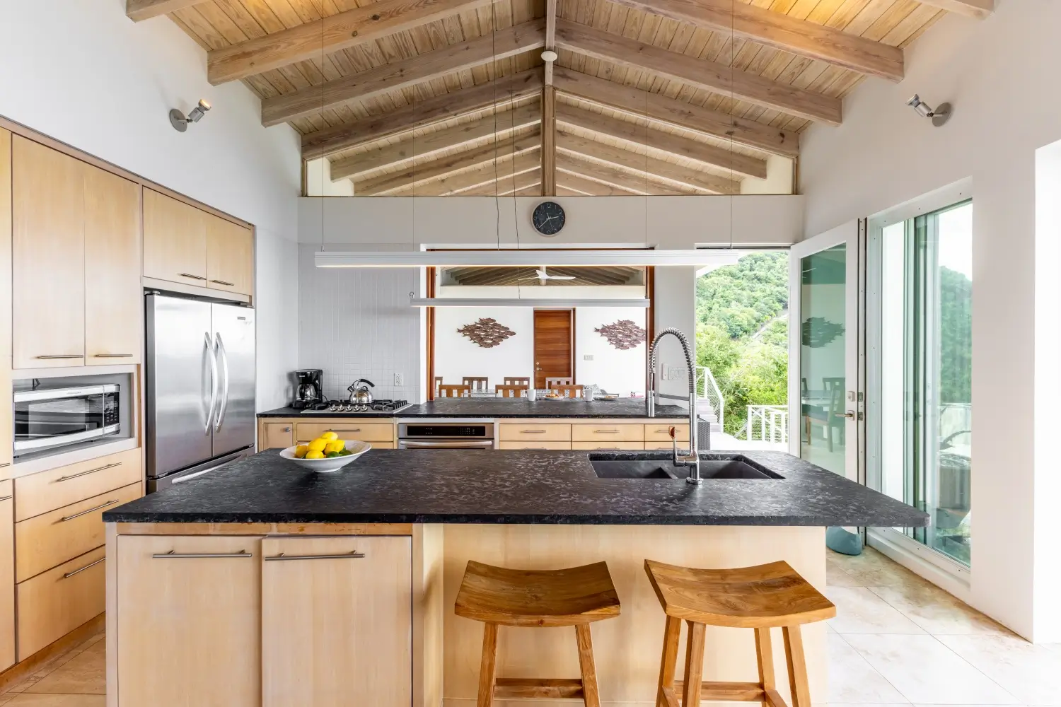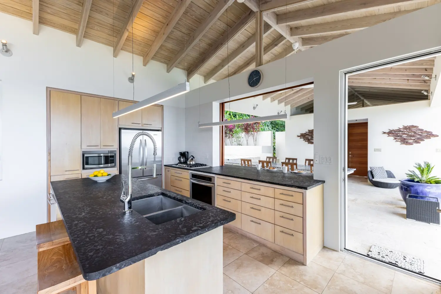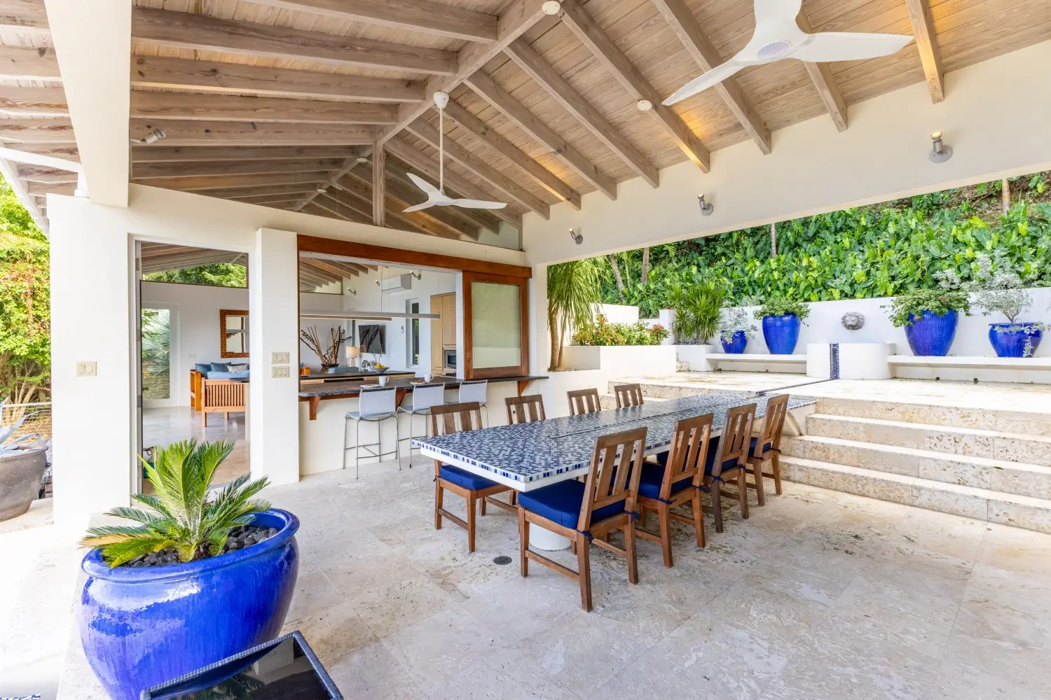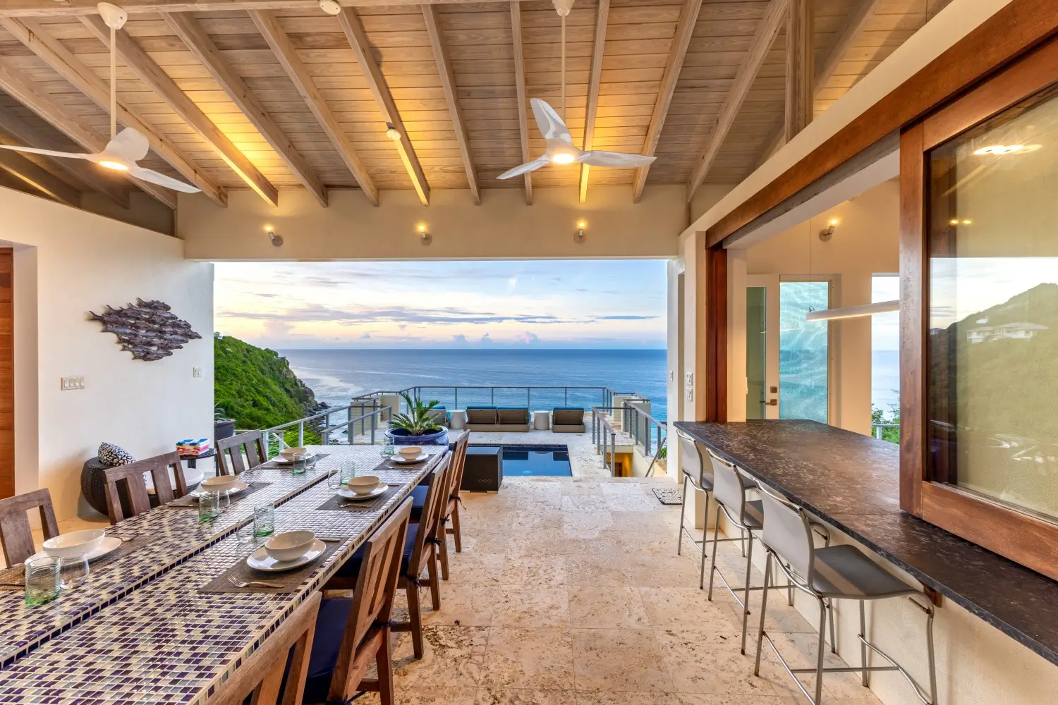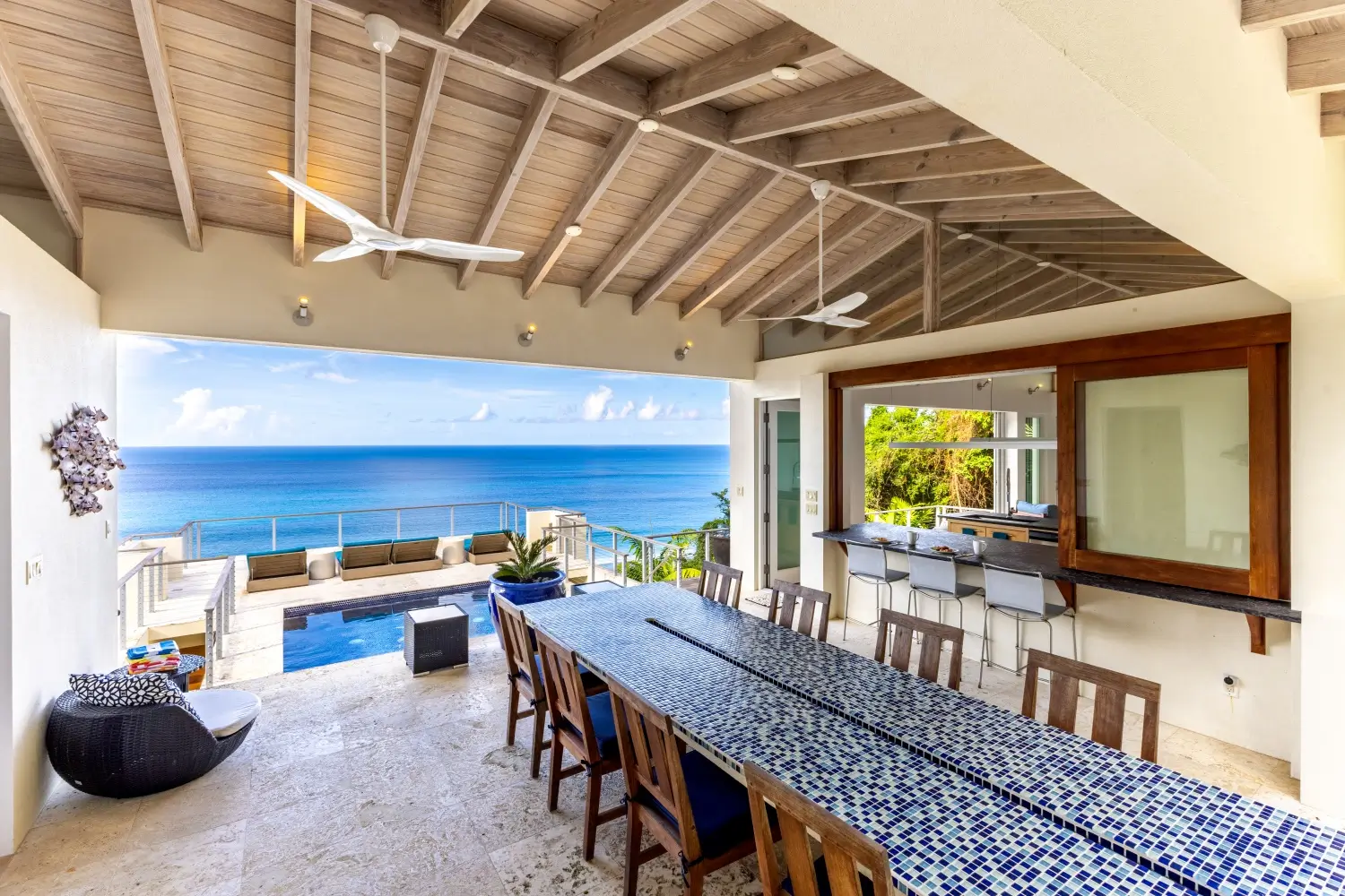 | Expansive patio overlooking pristine Trunk Bay beach 3.5 Baths Unique covered open-air dining table with built-in water feature Non-smoking Dishwasher Linens Outdoor BBQ grill Private walking path connecting to Villa Soleil if both are rented |